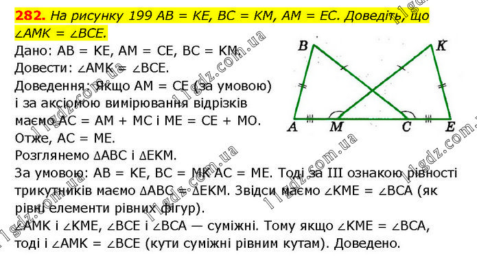 На рисунку 199 AB = KE, BC = KM, AM = EC. Доведіть, що ∠AMK = ∠BCE. Дано: AB = KE, AM = CE, BC = KM. Довести: ∠AMK = ∠BCE. Доведення: Якщо AM = CE (за умовою) і за аксіомою вимірювання відрізків маємо AC = AM + MC і ME = CE + MO. Отже, AC = ME. Розглянемо ∆ABC і ∆EKM. За умовою: AB = KE, BC = MK AC = ME. Тоді за III ознакою рівності трикутників маємо ∆ABC = ∆EKM. Звідси маємо ∠KME = ∠BCA (як рівні елементи рівних фігур). ∠AMK і ∠KME, ∠BCE і ∠BCA — суміжні. Тому якщо ∠KME = ∠BCA, тоді і ∠AMK = ∠BCE (кути суміжні рівним кутам). Доведено.