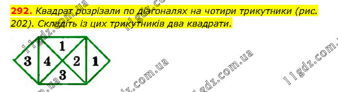 Квадрат розрізали по діагоналях на чотири трикутники (рис. 202). Складіть із цих трикутників два квадрати.
