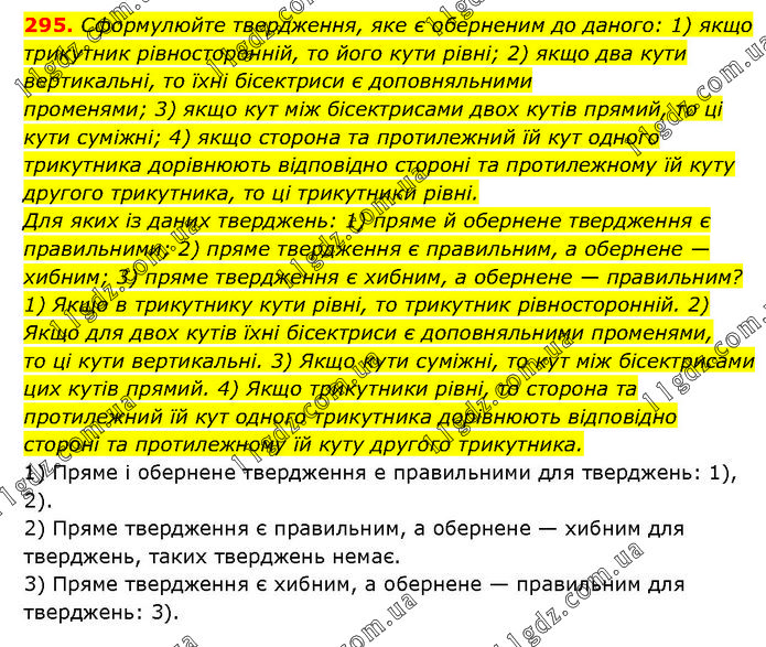 Сформулюйте твердження, яке є оберненим до даного: 1) якщо трикутник рівносторонній, то його кути рівні; 2) якщо два кути вертикальні, то їхні бісектриси є доповняльними променями; 3) якщо кут між бісектрисами двох кутів прямий, то ці кути суміжні; 4) якщо сторона та протилежний їй кут одного трикутника дорівнюють відповідно стороні та протилежному їй куту другого трикутника, то ці трикутники рівні. Для яких із даних тверджень: 1) пряме й обернене твердження є правильними; 2) пряме твердження є правильним, а обернене — хибним; 3) пряме твердження є хибним, а обернене — правильним? 1) Якщо в трикутнику кути рівні, то трикутник рівносторонній. 2) Якщо для двох кутів їхні бісектриси є доповняльними променями, то ці кути вертикальні. 3) Якщо кути суміжні, то кут між бісектрисами цих кутів прямий. 4) Якщо трикутники рівні, то сторона та протилежний їй кут одного трикутника дорівнюють відповідно стороні та протилежному їй куту другого трикутника. 1) Пряме і обернене твердження е правильними для тверджень: 1), 2). 2) Пряме твердження є правильним, а обернене — хибним для тверджень, таких тверджень немає. 3) Пряме твердження є хибним, а обернене — правильним для тверджень: 3).