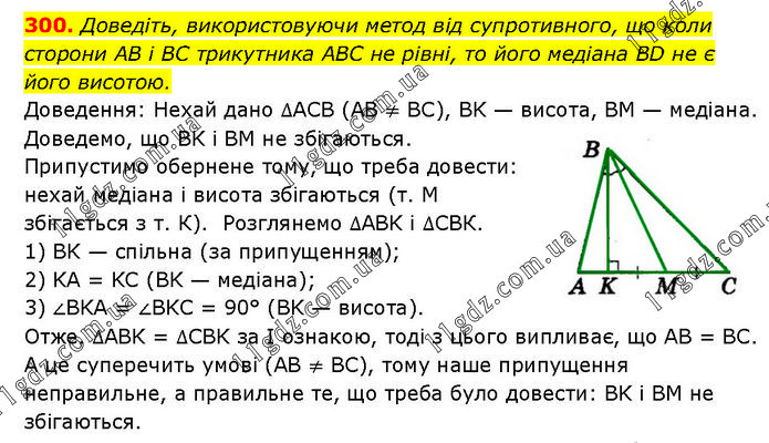 Доведіть, використовуючи метод від супротивного, що коли сторони AB і BC трикутника ABC не рівні, то його медіана BD не є його висотою. Доведення: Нехай дано ∆ACB (AB ≠ BC), BK — висота, BM — медіана. Доведемо, що BK і BM не збігаються. Припустимо обернене тому, що треба довести: нехай медіана і висота збігаються (т. M збігається з т. К). Розглянемо ∆ABK і ∆СВК. 1) BK — спільна (за припущенням); 2) KA = KC (BK — медіана); 3) ∠BKA = ∠BKC = 90° (BK — висота). Отже. ∆ABK = ∆CBK за І ознакою, тоді з цього випливає, що AB = BC. А це суперечить умові (AB ≠ BC), тому наше припущення неправильне, а правильне те, що треба було довести: BK і BM не збігаються.