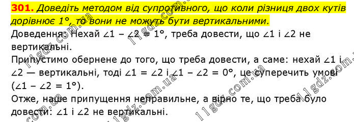 Доведіть методом від супротивного, що коли різниця двох кутів дорівнює 1°, то вони не можуть бути вертикальними. Доведення: Нехай ∠1 – ∠2 = 1°, треба довести, що ∠1 і ∠2 не вертикальні. Припустимо обернене до того, що треба довести, а саме: нехай ∠1 і ∠2 — вертикальні, тоді ∠1 = ∠2 і ∠1 – ∠2 = 0°, це суперечить умові (∠1 – ∠2 = 1°). Отже, наше припущення неправильне, а вірно те, що треба було довести: ∠1 і ∠2 не вертикальні.