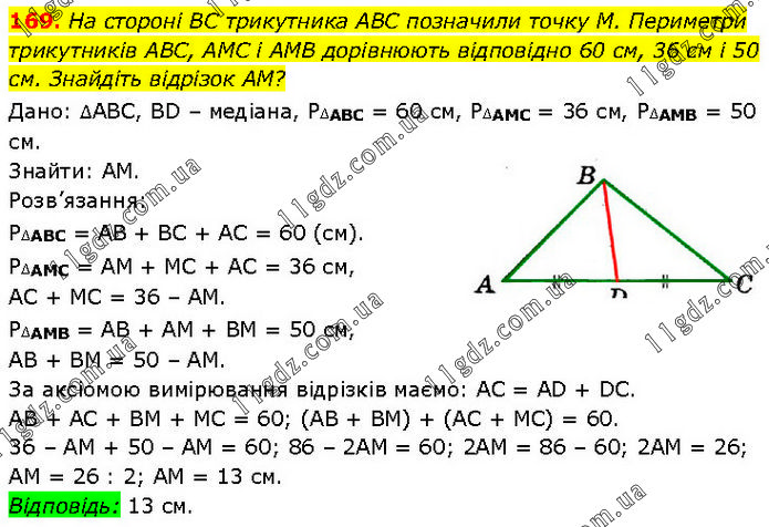 На стороні BC трикутника ABC позначили точку М. Периметри трикутників ABC, AMC і AMB дорівнюють відповідно 60 см, 36 см і 50 см. Знайдіть відрізок AM? Дано: ∆ABC, BD – медіана, P∆ABC = 60 см, P∆AМC = 36 см, P∆AМВ = 50 см. Знайти: АМ. Розв’язання: P∆ABC = AB + BC + AC = 60 (см). P∆AМС = АМ + МС + AС = 36 см, AС + МС = 36 – АМ. P∆АМВ = АВ + АМ + ВМ = 50 см, АВ + ВМ = 50 – АМ. За аксіомою вимірювання відрізків маємо: AC = AD + DC. AB + АC + ВМ + МС = 60; (АВ + ВМ) + (АC + МС) = 60. 36 – АМ + 50 – АМ = 60; 86 – 2АМ = 60; 2АМ = 86 – 60; 2АМ = 26; АМ = 26 : 2; АМ = 13 см. Відповідь: 13 см.