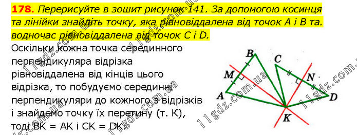 Перерисуйте в зошит рисунок 141. За допомогою косинця та лінійки знайдіть точку, яка рівновіддалена від точок A і В та. водночас рівновіддалена від точок C і D. Оскільки кожна точка серединного перпендикуляра відрізка рівновіддалена від кінців цього відрізка, то побудуємо серединні перпендикуляри до кожного з відрізків і знайдемо точку їх перетину (т. К), тоді BK = AK і CK = DK.