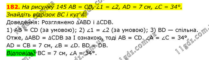 На рисунку 145 AB = CD, ∠1 = ∠2, AD = 7 см, ∠C = 34°. Знайдіть відрізок BC і кут А. Доведення: Розглянемо ΔABD і ΔCDB. 1) AB = CD (за умовою); 2) ∠1 = ∠2 (за умовою); 3) BD — спільна. Отже, ΔABD = ΔCDB за І ознакою, тоді AB = CD. ∠A = ∠C = 34°. AD = CB = 7 см, ∠B = ∠D. BD = DB. Відповідь: BC = 7 см, ∠A = 34°.