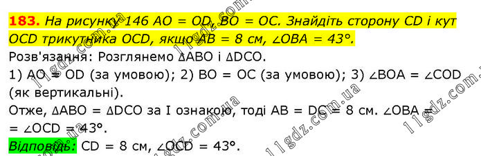 На рисунку 146 AO = OD, BO = ОС. Знайдіть сторону CD і кут OCD трикутника OCD, якщо AB = 8 см, ∠OBA = 43°. Розв'язання: Розглянемо ΔАВО і ΔDCO. 1) AO = OD (за умовою); 2) BO = OC (за умовою); 3) ∠BOA = ∠COD (як вертикальні). Отже, ΔABO = ΔDCO за І ознакою, тоді AB = DC = 8 см. ∠OBA = = ∠OCD = 43°. Відповідь: CD = 8 см, ∠OCD = 43°.