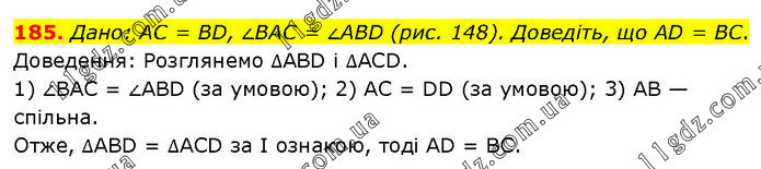 Дано: AC = BD, ∠BAC = ∠ABD (рис. 148). Доведіть, що AD = BC. Доведення: Розглянемо ΔABD і ΔACD. 1) ∠ВАC = ∠ABD (за умовою); 2) AC = DD (за умовою); 3) AB — спільна. Отже, ΔABD = ΔACD за І ознакою, тоді AD = BC.
