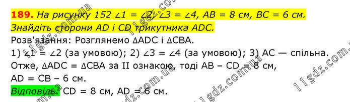 На рисунку 152 ∠1 = ∠2, ∠3 = ∠4, AB = 8 см, BC = 6 см. Знайдіть сторони AD і CD трикутника ADC. Розв'язання: Розглянемо ΔADC і ΔСВА. 1) ∠1 = ∠2 (за умовою); 2) ∠3 = ∠4 (за умовою); 3) AC — спільна. Отже, ΔADC = ΔCBA за II ознакою, тоді AB – CD = 8 см, AD = CB – 6 см. Відповідь: CD = 8 см, AD = 6 см.
