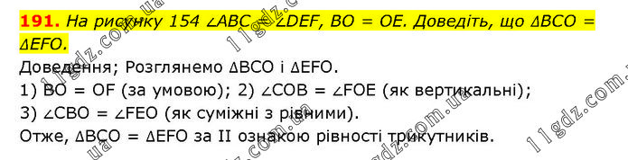 На рисунку 154 ∠ABC = ∠DEF, BO = OE. Доведіть, що ΔBCO = ΔEFO. Доведення; Розглянемо ΔBCO і ΔEFO. 1) BO = OF (за умовою); 2) ∠COB = ∠FOE (як вертикальні); 3) ∠CBO = ∠FEO (як суміжні з рівними). Отже, ΔBCO = ΔEFO за II ознакою рівності трикутників.