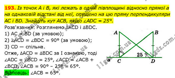 Із точок А і В, які лежать в одній півплощині відносно прямої а на однаковій відстані від неї, опущено на цю пряму перпендикуляри AC і BD. Знайдіть кут ACВ, якщо ∠ADC = 25°. Розв'язання: Розглянемо ΔACD і ΔBDC. 1) AC = BD (за умовою); 2) ∠ACD = ∠BDC = 90° (за умовою); 3) CD — спільна. Отже, ΔACD = ΔBDC за І ознакою, тоді ∠ADC = ∠BCD = 25°, ∠ACD = ∠ACB + ∠BCD, ∠ACB = 90° – 25° = 65°. Відповідь: ∠ACB = 65°.