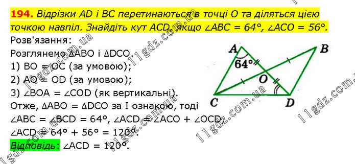 Відрізки AD і BC перетинаються в точці O та діляться цією точкою навпіл. Знайдіть кут ACD, якщо ∠ABC = 64°, ∠ACO = 56°. Розв'язання: Розглянемо ΔABO і ΔDCO. 1) BO = OC (за умовою); 2) AO = OD (за умовою); 3) ∠BOA = ∠COD (як вертикальні). Отже, ΔABO = ΔDCO за І ознакою, тоді ∠ABC = ∠BCD = 64°, ∠ACD = ∠ACO + ∠OCD, ∠ACD = 64° + 56° = 120°. Відповідь: ∠ACD = 120°.