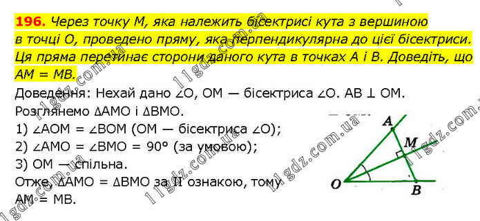 Через точку М, яка належить бісектрисі кута з вершиною в точці О, проведено пряму, яка перпендикулярна до цієї бісектриси. Ця пряма перетинає сторони даного кута в точках А і В. Доведіть, що AM = MB. Доведення: Нехай дано ∠O, OM — бісектриса ∠O. AB ⊥ OM. Розглянемо ΔAMO і ΔBMO. 1) ∠AOM = ∠BOM (ОМ — бісектриса ∠O); 2) ∠AMO = ∠BMO = 90° (за умовою); 3) OM — спільна. Отже, ΔAMO = ΔBMO за II ознакою, тому AM = MB.