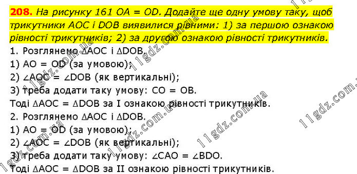 На рисунку 161 OA = OD. Додайте ще одну умову таку, щоб трикутники AOC і DOB виявилися рівними: 1) за першою ознакою рівності трикутників; 2) за другою ознакою рівності трикутників. 1. Розглянемо ΔAOC і ΔDOB. 1) AO = OD (за умовою); 2) ∠AOC = ∠DOB (як вертикальні); 3) треба додати таку умову: CO = OB. Тоді ΔAOC = ΔDOB за І ознакою рівності трикутників. 2. Розглянемо ΔAOC і ΔDOB. 1) AO = OD (за умовою); 2) ∠AOC = ∠DOB (як вертикальні); 3) треба додати таку умову: ∠CAO = ∠BDO. Тоді ΔAOC = ΔDOB за II ознакою рівності трикутників.