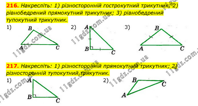 216. Накресліть: 1) різносторонній гострокутний трикутник; 2) рівнобедрений прямокутний трикутник; 3) рівнобедрений тупокутний трикутник. 1) 2) 3) 217. Накресліть: 1) різносторонній прямокутний трикутник; 2) різносторонній тупокутний трикутник.