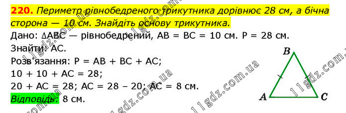 Периметр рівнобедреного трикутника дорівнює 28 см, а бічна сторона — 10 см. Знайдіть основу трикутника. Дано: ΔABC — рівнобедрений, AB = BC = 10 см. P = 28 см. Знайти: AC. Розв'язання: P = AB + BC + AC; 10 + 10 + AC = 28; 20 + AC = 28; AC = 28 – 20; AC = 8 см. Відповідь: 8 см.