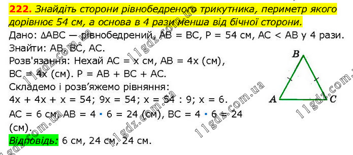Знайдіть сторони рівнобедреного трикутника, периметр якого дорівнює 54 см, а основа в 4 рази менша від бічної сторони. Дано: ΔABC — рівнобедрений, AB = BC, P = 54 см, AC < AB у 4 рази. Знайти: AB, BC, AC. Розв'язання: Нехай AC = х см, AB = 4х (см), BC = 4x (см). P = AB + BC + AC. Складемо і розв’яжемо рівняння: 4x + 4х + х = 54; 9х = 54; х = 54 : 9; х = 6. AC = 6 см, AB = 4 ∙ 6 = 24 (см), BC = 4 ∙ 6 = 24 (см). Відповідь: 6 см, 24 см, 24 см.