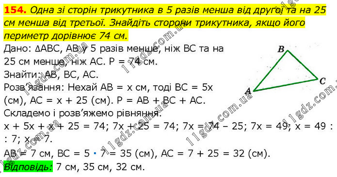 Одна зі сторін трикутника в 5 разів менша від другої та на 25 см менша від третьої. Знайдіть сторони трикутника, якщо його периметр дорівнює 74 см. Дано: ∆ABC, AB у 5 разів менше, ніж BC та на 25 см менше, ніж AC. P = 74 см. Знайти: AB, BC, AC. Розв’язання: Нехай AB = х см, тоді BC = 5х (см), AC = х + 25 (см). P = AB + BC + AC. Складемо і розв’яжемо рівняння. х + 5х + х + 25 = 74; 7x + 25 = 74; 7x = 74 – 25; 7х = 49; х = 49 : : 7; х = 7. AB = 7 см, BC = 5 ∙ 7 = 35 (см), AC = 7 + 25 = 32 (см). Відповідь: 7 см, 35 см, 32 см.