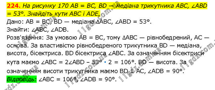 На рисунку 170 AB = BC, BD — медіана трикутника ABC, ∠ABD = 53°. Знайдіть кути ABC і ADE. Дано: AB = BC, BD — медіана ΔABC, ∠ABD = 53°. Знайти: ∠ABC, ∠ADB. Розв'язання: За умовою AB = BC, тому ΔABC — рівнобедрений, AC — основа. За властивістю рівнобедреного трикутника BD — медіана, висота, бісектриса. BD бісектриса ∠ABC. За означенням бісектриси кута маємо ∠ABC = 2∠ABD – 53° ∙ 2 = 106°. BD — висота. За означенням висоти трикутника маємо BD ⊥ AC, ∠ADB = 90°. Відповідь: ∠ABC = 106°, ∠ADB = 90°.