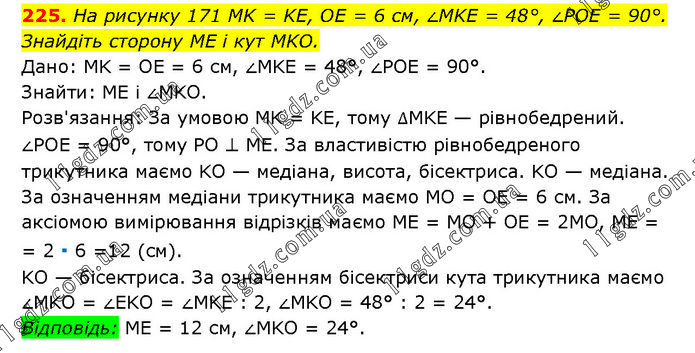 На рисунку 171 MK = KE, OE = 6 см, ∠MKE = 48°, ∠POE = 90°. Знайдіть сторону ME і кут MKO. Дано: MK = OE = 6 см, ∠MKE = 48°, ∠POE = 90°. Знайти: ME і ∠MKO. Розв'язання: За умовою MK = KE, тому ΔMKE — рівнобедрений. ∠POE = 90°, тому PO ⊥ ME. За властивістю рівнобедреного трикутника маємо KO — медіана, висота, бісектриса. KO — медіана. За означенням медіани трикутника маємо MO = OE = 6 см. За аксіомою вимірювання відрізків маємо ME = MO + OE = 2МО, ME = = 2 ∙ 6 =12 (см). KO — бісектриса. За означенням бісектриси кута трикутника маємо ∠MKO = ∠EKO = ∠MKE : 2, ∠MKO = 48° : 2 = 24°. Відповідь: ME = 12 см, ∠MKO = 24°.
