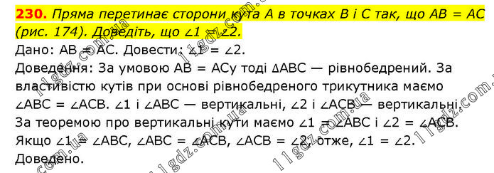 Пряма перетинає сторони кута А в точках B i C так, що AB = AC (рис. 174). Доведіть, що ∠1 = ∠2. Дано: AB = AC. Довести: ∠1 = ∠2. Доведення: За умовою AB = ACy тоді ΔABC — рівнобедрений. За властивістю кутів при основі рівнобедреного трикутника мaємo ∠ABC = ∠ACB. ∠1 i ∠ABC — вертикальні, ∠2 і ∠ACB — вертикальні. За теоремою про вертикальні кути маємо ∠1 = ∠ABC і ∠2 = ∠ACB. Якщо ∠1 = ∠ABC, ∠ABC = ∠ACB, ∠ACB = ∠2, отже, ∠1 = ∠2. Доведено.