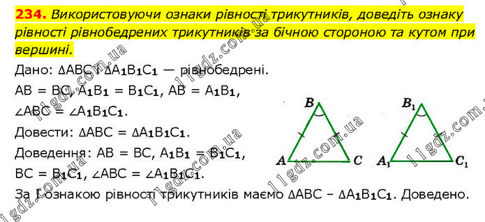 Використовуючи ознаки рівності трикутників, доведіть ознаку рівності рівнобедрених трикутників за бічною стороною та кутом при вершині. Дано: ΔABC і ΔA1B1C1 — рівнобедрені. AB = BC, A1B1 = B1C1, AB = A1B1, ∠ABC = ∠A1B1C1. Довести: ΔАВС = ΔA1B1C1. Доведення: AB = BC, A1B1 = B1C1, BC = B1C1, ∠ABC = ∠A1B1C1. За І ознакою рівності трикутників маємо ΔАВС – ΔA1B1C1. Доведено.