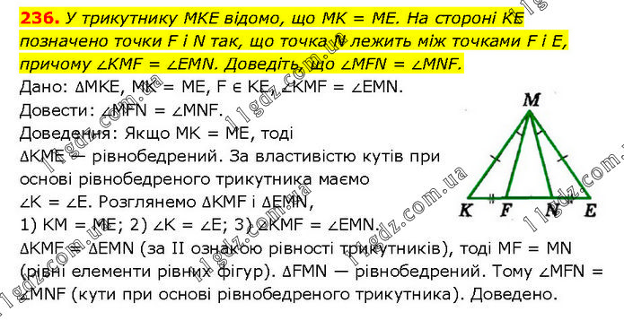 У трикутнику MKE відомо, що MK = ME. На стороні KE позначено точки F i N так, що точка N лежить між точками F і E, причому ∠KMF = ∠EMN. Доведіть, що ∠MFN = ∠MNF. Дано: ΔMKE, MK = ME, F ∈ KE, ∠KMF = ∠EMN. Довести: ∠MFN = ∠MNF. Доведення: Якщо МK = ME, тоді ΔKME — рівнобедрений. За властивістю кутів при основі рівнобедреного трикутника маємо ∠K = ∠E. Розглянемо ΔKMF і ΔEMN, 1) KM = ME; 2) ∠K = ∠E; 3) ∠KMF = ∠EMN. ΔKMF = ΔEMN (за II ознакою рівності трикутників), тоді MF = MN (рівні елементи рівних фігур). ΔFMN — рівнобедрений. Тому ∠MFN = ∠MNF (кути при основі рівнобедреного трикутника). Доведено.