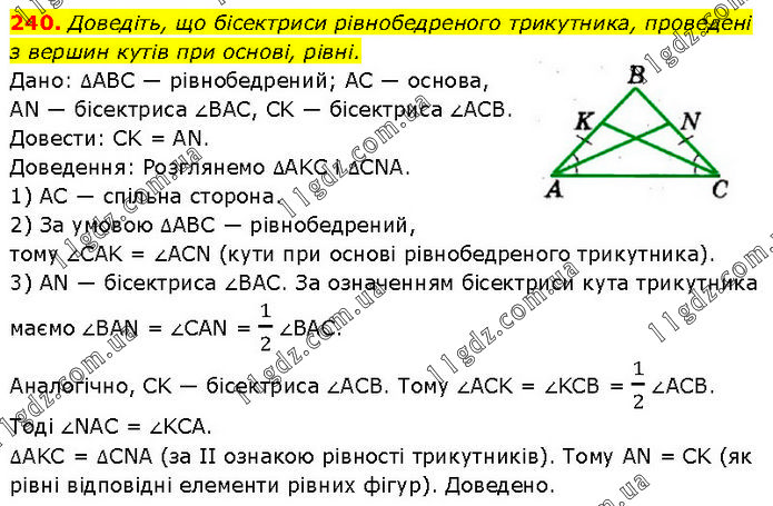Доведіть, що бісектриси рівнобедреного трикутника, проведені з вершин кутів при основі, рівні. Дано: ΔABC — рівнобедрений; AC — основа, AN — бісектриса ∠BAC, CK — бісектриса ∠ACB. Довести: CK = AN. Доведення: Розглянемо ΔAKC і ΔCNA. 1) AC — спільна сторона. 2) За умовою ΔABC — рівнобедрений, тому ∠CAK = ∠ACN (кути при основі рівнобедреного трикутника). 3) AN — бісектриса ∠BAC. За означенням бісектриси кута трикутника маємо ∠BAN = ∠CAN = 1/2 ∠BAC. Аналогічно, CK — бісектриса ∠ACB. Тому ∠ACK = ∠KCB = 1/2 ∠ACB. Тоді ∠NAC = ∠KCА. ΔАKС = ΔCNA (за II ознакою рівності трикутників). Тому AN = CK (як рівні відповідні елементи рівних фігур). Доведено.
