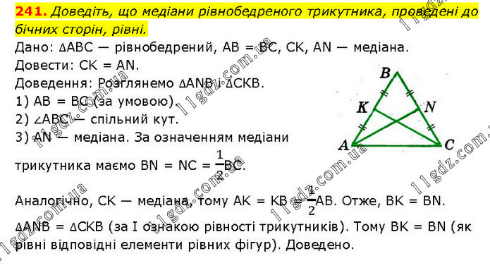 Доведіть, що медіани рівнобедреного трикутника, проведені до бічних сторін, рівні. Дано: ΔABC — рівнобедрений, AB = BC, CK, AN — медіана. Довести: CK = AN. Доведення: Розглянемо ΔANB і ΔСКВ. 1) AB = BC (за умовою). 2) ∠ABC — спільний кут. 3) AN — медіана. За означенням медіани трикутника маємо BN = NC = 1/2BC. Аналогічно, CK — медіана, тому AK = KB = 1/2АВ. Отже, BK = BN. ΔANB = ΔCKB (за І ознакою рівності трикутників). Тому BK = BN (як рівні відповідні елементи рівних фігур). Доведено.