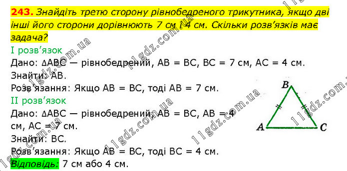 Знайдіть третю сторону рівнобедреного трикутника, якщо дві інші його сторони дорівнюють 7 см і 4 см. Скільки розв’язків має задача? І розв’язок Дано: ΔABC — рівнобедрений, AB = BC, BC = 7 см, AC = 4 см. Знайти: AB. Розв’язання: Якщо AB = BC, тоді AB = 7 см. II розв’язок Дано: ΔABC — рівнобедрений, AB = BC, AB = 4 см, AC = 7 см. Знайти: BC. Розв’язання: Якщо AB = BC, тоді BC = 4 см. Відповідь: 7 см або 4 см.