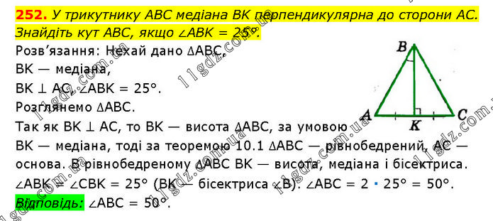 У трикутнику ABC медіана BK перпендикулярна до сторони AC. Знайдіть кут ABC, якщо ∠ABK = 25°. Розв’язання: Нехай дано ∆ABC, BK — медіана, BK ⊥ AC, ∠ABK = 25°. Розглянемо ∆АВС. Так як ВK ⊥ AC, то BK — висота ∆ABC, за умовою BK — медіана, тоді за теоремою 10.1 ∆ABC — рівнобедрений, AC — основа. В рівнобедреному ∆ABC BK — висота, медіана і бісектриса. ∠ABK = ∠CBK = 25° (BK — бісектриса ∠B). ∠ABC = 2 ∙ 25° = 50°. Відповідь: ∠ABC = 50°.