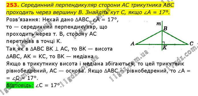 Серединний перпендикуляр сторони AC трикутника ABC проходить через вершину В. Знайдіть кут С, якщо ∠A = 17°. Розв’язання: Нехай дано ∆ABC, ∠A = 17°, то — серединний перпендикуляр, що проходить через т. В, сторону AC перетинав в точці К. Так як в ∆ABC BK ⊥ AC, то BK — висота ∆ABC, AK = KC, то BK — медіана. Якщо в трикутнику висота і медіана збігаються, то цей трикутник рівнобедрений, AC — основа. Якщо ∆ABC — рівнобедрений, то ∠A = = ∠C = 17°. Відповідь: ∠C = 17°.