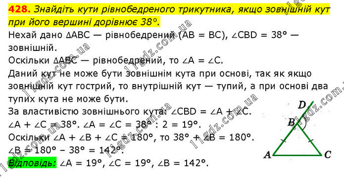 Знайдіть кути рівнобедреного трикутника, якщо зовнішній кут при його вершині дорівнює 38°. Нехай дано ∆ABC — рівнобедрений (АВ = BC), ∠CBD = 38° — зовнішній. Оскільки ∆ABC — рівнобедрений, то ∠A = ∠C. Даний кут не може бути зовнішнім кута при основі, так як якщо зовнішній кут гострий, то внутрішній кут — тупий, а при основі два тупих кута не може бути. За властивістю зовнішнього кута: ∠CBD = ∠A + ∠C. ∠A + ∠C = 38°. ∠A = ∠C = 38° : 2 = 19°. Оскільки ∠A + ∠B + ∠C = 180°, то 38° + ∠B = 180°. ∠B = 180° – 38° = 142°. Відповідь: ∠A = 19°, ∠C = 19°, ∠B = 142°.