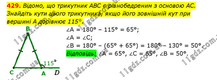 Відомо, що трикутник ABC є рівнобедреним з основою AC. Знайдіть кути цього трикутника, якщо його зовнішній кут при вершині А дорівнює 115°. ∠А = 180° – 115° = 65°; ∠А = ∠С; ∠В = 180° – (65° + 65°) = 180° – 130° = 50°. Відповідь: ∠A = 65°, ∠C = 65°, ∠B = 50°.