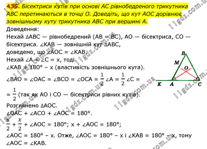 Бісектриси кутів при основі AC рівнобедреного трикутника ABC перетинаються в точці О. Доведіть, що кут AOC дорівнює зовнішньому куту трикутника ABC при вершині А. Доведення: Нехай ∆АВС — рівнобедрений (AB = BC), AO — бісектриса, CO — бісектриса. ∠KAB — зовнішній кут ∆ABC, доведемо, що ∠AOC = ∠KAB. Нехай ∠A = ∠C = х, тоді ∠KAB = 180° – x (властивість зовнішнього кута). ∠ВАО = ∠OAC = ∠BCO = ∠OCA = 1/2∠A = 1/2∠C = 1/2 (так як AO і CO — бісектриси рівних кутів). Розглянемо ∆АОС. ∠OAC + ∠ACO + ∠AOC = 180°. х/2 + x/2 + ∠AOC = 180°; x + ∠AOC = 180°; ∠AOC = 180° – x. Отже, ∠AOC = 180° – x і ∠KAB = 180° – x, тому ∠AOC = ∠KAB.
