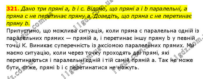 Дано три прямі а, b і с. Відомо, що прямі а і b паралельні, а пряма с не перетинає пряму а. Доведіть, що пряма с не перетинає пряму b. Припустимо, що можлива ситуація, коли пряма c паралельна одній із паралельних прямих — прямій a, і перетинає іншу пряму b у певній точці K. Виникає суперечність із аксіомою паралельних прямих. Ми маємо ситуацію, коли через точку проходять дві прямі, які перетинаються і паралельні одній і тій самій прямій a. Так не може бути, отже, прямі b і c перетинатися не можуть.