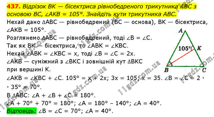 Відрізок BK — бісектриса рівнобедреного трикутника ABC з основою BC, ∠AKB = 105°. Знайдіть кути трикутника ABC. Нехай дано ∆ABC — рівнобедрений (BC — основа), BK — бісектриса, ∠AKB = 105°. Розглянемо ∆ABC — рівнобедрений, тоді ∠B = ∠C. Так як BK — бісектриса, то ∠ABK = ∠KBC. Нехай ∠ABK = ∠KBC = x, тоді ∠B = ∠C = 2x. ∠AKB — суміжний з ∠BKC і зовнішній кут ∆BKC при вершині K. ∠AKB = ∠KBC + ∠C. 105° = x + 2x; 3x = 105; x = 35. ∠B = ∠C = 2 ∙ 35° = 70°. В ∆ABC: ∠A + ∠B + ∠C = 180°. ∠A + 70° + 70° = 180°; ∠A = 180° – 140°; ∠A = 40°. Відповідь: ∠B = ∠C = 70°; ∠A = 40°.