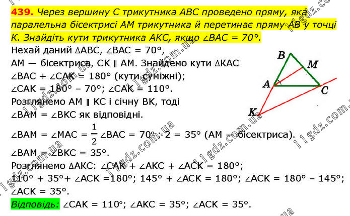 Через вершину C трикутника ABC проведено пряму, яка паралельна бісектрисі AM трикутника й перетинає пряму AB у точці К. Знайдіть кути трикутника АКС, якщо ∠BAC = 70°. Нехай даний ∆ABC, ∠BAC = 70°, AM — бісектриса, CK ∥ AM. Знайдемо кути ∆КАС ∠BAC + ∠CAK = 180° (кути суміжні); ∠CAK = 180° – 70°; ∠CAK = 110°. Розглянемо AM ∥ KC і січну BK, тоді ∠BAM = ∠BKC як відповідні. ∠BAM = ∠MAC = 1/2 ∠BAC = 70° : 2 = 35° (AM — бісектриса). ∠BAM = ∠BKC = 35°. Розглянемо ∆АКС: ∠CAK + ∠AKC + ∠ACK = 180°; 110° + 35° + ∠ACK = 180°; 145° + ∠ACK = 180°; ∠ACK = 180° – 145°; ∠ACK = 35°. Відповідь: ∠CAK = 110°; ∠AKC = 35°; ∠ACK = 35°.