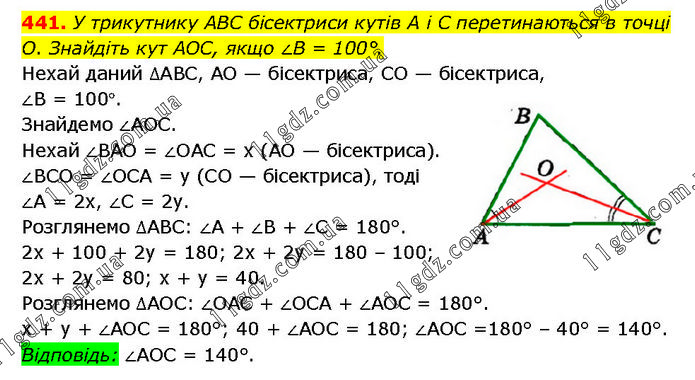 У трикутнику ABC бісектриси кутів A i С перетинаються в точці О. Знайдіть кут АОС, якщо ∠B = 100°. Нехай даний ∆ABC, AO — бісектриса, CO — бісектриса, ∠B = 100°. Знайдемо ∠AOC. Нехай ∠BAO = ∠OAC = x (AO — бісектриса). ∠BCO = ∠OCA = у (CO — бісектриса), тоді ∠A = 2х, ∠C = 2у. Розглянемо ∆ABC: ∠A + ∠B + ∠C = 180°. 2х + 100 + 2у = 180; 2х + 2y = 180 – 100; 2х + 2у = 80; х + у = 40. Розглянемо ∆AOC: ∠OAC + ∠OCA + ∠AOC = 180°. х + у + ∠AOC = 180°; 40 + ∠AOC = 180; ∠AOC =180° – 40° = 140°. Відповідь: ∠AOC = 140°.