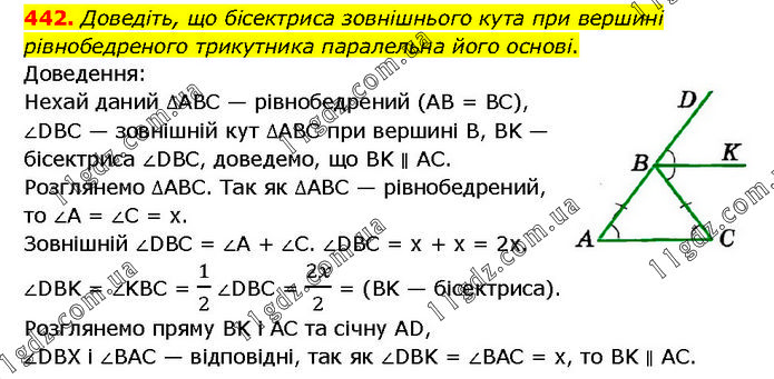 Доведіть, що бісектриса зовнішнього кута при вершині рівнобедреного трикутника паралельна його основі. Доведення: Нехай даний ∆ABC — рівнобедрений (AB = BC), ∠DBC — зовнішній кут ∆ABC при вершині B, BK — бісектриса ∠DBC, доведемо, що BK ∥ AC. Розглянемо ∆ABC. Так як ∆ABC — рівнобедрений, то ∠A = ∠C = х. Зовнішній ∠DBC = ∠A + ∠C. ∠DBC = х + х = 2х. ∠DBK = ∠KBC = 1/2∠DBC = 2x/2 = (BK — бісектриса). Розглянемо пряму BK і AC та січну AD, ∠DBX і ∠BAC — відповідні, так як ∠DBK = ∠BAC = x, то BK ∥ AC.