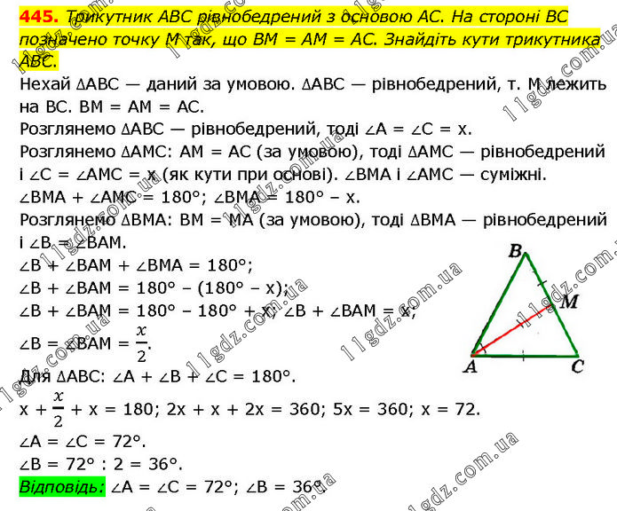 Трикутник ABC рівнобедрений з основою AC. На стороні BC позначено точку M так, що BM = AM = AC. Знайдіть кути трикутника ABC. Нехай ∆АВС — даний за умовою. ∆ABC — рівнобедрений, т. M лежить на BC. BM = AM = AC. Розглянемо ∆ABC — рівнобедрений, тоді ∠A = ∠C = х. Розглянемо ∆АМС: AM = AC (за умовою), тоді ∆AMC — рівнобедрений і ∠C = ∠AMC = x (як кути при основі). ∠BMA і ∠AMC — суміжні. ∠BMA + ∠AMC = 180°; ∠BMA = 180° – x. Розглянемо ∆ВМА: BM = MA (за умовою), тоді ∆BMA — рівнобедрений і ∠B = ∠BAM. ∠B + ∠BAM + ∠BMA = 180°; ∠B + ∠BAM = 180° – (180° – x); ∠B + ∠BAM = 180° – 180° + x; ∠B + ∠BAM = x; ∠B = ∠BAM = x/2. Для ∆АВС: ∠A + ∠B + ∠C = 180°. x + x/2 + x = 180; 2x + х + 2х = 360; 5x = 360; x = 72. ∠A = ∠C = 72°. ∠B = 72° : 2 = 36°. Відповідь: ∠A = ∠C = 72°; ∠B = 36°.