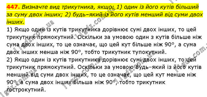 Визначте вид трикутника, якщо: 1) один із його кутів більший за суму двох інших; 2) будь–який із його кутів менший від суми двох інших. 1) Якщо один із кутів трикутника дорівнює сумі двох інших, то цей трикутник прямокутний. Оскільки за умовою один з кутів більше ніж сума двох інших, то це означає, що цей кут більше ніж 90°, а сума двох інших менша ніж 90°, тобто трикутник тупокутний. 2) Якщо один із кутів трикутника дорівнює сумі двох інших, то цей трикутник прямокутний. Оскільки за умовою будь–який із його кутів менший від суми двох інших, то це означає, що цей кут менше ніж 90°, а сума двох інших більша ніж 90°, тобто трикутник гострокутний.