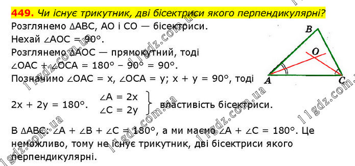 Чи існує трикутник, дві бісектриси якого перпендикулярні? Розглянемо ∆ABC, AO і CO — бісектриси. Нехай ∠AOC = 90°. Розглянемо ∆AOC — прямокутний, тоді ∠OAC + ∠OCA = 180° – 90° = 90°. Позначимо ∠OAC = x, ∠OCA = у; х + у = 90°, тоді 2х + 2у = 180°. властивість бісектриси. В ∆ABC: ∠A + ∠B + ∠C = 180°, а ми маємо ∠A + ∠C = 180°. Це неможливо, тому не існує трикутник, дві бісектриси якого перпендикулярні.