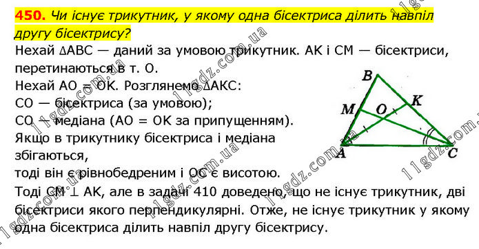 Чи існує трикутник, у якому одна бісектриса ділить навпіл другу бісектрису? Нехай ∆ABC — даний за умовою трикутник. AK і CM — бісектриси, перетинаються в т. О. Нехай AO = OK. Розглянемо ∆АКС: CO — бісектриса (за умовою); CO — медіана (AO = OK за припущенням). Якщо в трикутнику бісектриса і медіана збігаються, тоді він є рівнобедреним і OC є висотою. Тоді CM ⊥ AK, але в задачі 410 доведено, що не існує трикутник, дві бісектриси якого перпендикулярні. Отже, не існує трикутник у якому одна бісектриса ділить навпіл другу бісектрису.