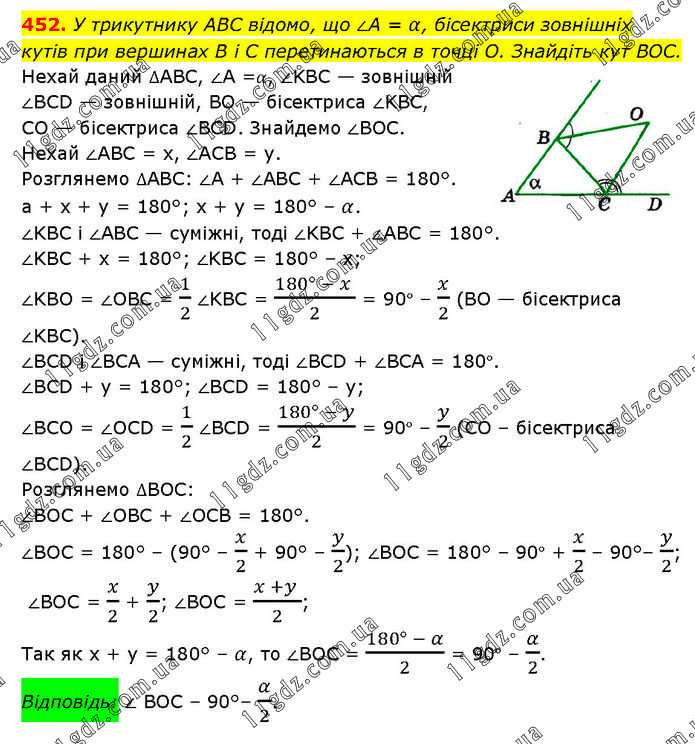 У трикутнику ABC відомо, що ∠A = α, бісектриси зовнішніх кутів при вершинах B i C перетинаються в точці О. Знайдіть кут BOC. Нехай даний ∆ABC, ∠A =α, ∠KBC — зовнішній ∠BCD — зовнішній, BO — бісектриса ∠KBC, CO — бісектриса ∠BCD. Знайдемо ∠BOC. Нехай ∠ABC = x, ∠ACB = у. Розглянемо ∆ABC: ∠A + ∠ABC + ∠ACB = 180°. а + х + у = 180°; х + у = 180° – α. ∠KBC і ∠ABC — суміжні, тоді ∠KBC + ∠ABC = 180°. ∠KBC + х = 180°; ∠KBC = 180° – х; ∠KBO = ∠OBC = 1/2∠KBC = (180° - x )/2 = 90° – x/2 (BO — бісектриса ∠KBC). ∠BCD і ∠BCA — суміжні, тоді ∠BCD + ∠BCA = 180°. ∠BCD + у = 180°; ∠BCD = 180° – y; ∠BCO = ∠OCD = 1/2∠BCD = (180° - y)/2 = 90° – y/2 (СО – бісектриса ∠BCD). Розглянемо ∆BOC: ∠BOC + ∠OBC + ∠OCB = 180°. ∠BOC = 180° – (90° – x/2 + 90° – y/2); ∠BOC = 180° – 90° + x/2 – 90°– y/2; ∠BOC = x/2 + y/2; ∠BOC = (x + y )/2; Так як x + у = 180° – α, то ∠BOC = (180° - α)/2 = 90° – α/2. Відповідь: ∠ BOC – 90°– α/2.