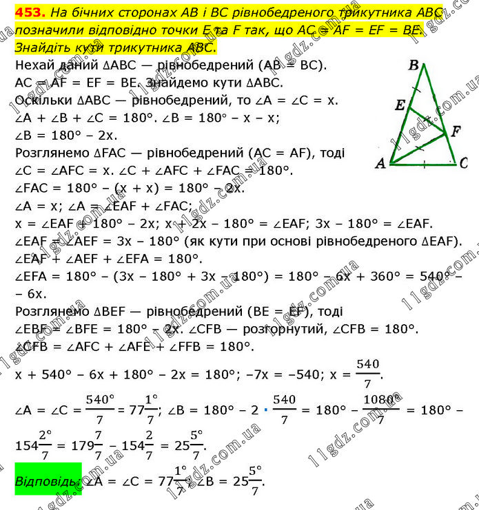 На бічних сторонах AB і BC рівнобедреного трикутника ABC позначили відповідно точки E та F так, що AC = AF = EF = BE. Знайдіть кути трикутника ABC. Нехай даний ∆ABC — рівнобедрений (AB = BC). AC = AF = EF = BE. Знайдемо кути ∆ABC. Оскільки ∆ABC — рівнобедрений, то ∠A = ∠C = х. ∠A + ∠B + ∠C = 180°. ∠B = 180° – х – х; ∠B = 180° – 2х. Розглянемо ∆FAC — рівнобедрений (AC = AF), тоді ∠C = ∠AFC = x. ∠C + ∠AFC + ∠FAC = 180°. ∠FAC = 180° – (х + х) = 180° – 2х. ∠A = х; ∠A = ∠EAF + ∠FAC; х = ∠EAF + 180° – 2x; x + 2x – 180° = ∠EAF; 3x – 180° = ∠EAF. ∠EAF = ∠AEF = 3x – 180° (як кути при основі рівнобедреного ∆EAF). ∠EAF + ∠AEF + ∠EFA = 180°. ∠EFA = 180° – (3x – 180° + 3x – 180°) = 180° – 6x + 360° = 540° – 6x. Розглянемо ∆BEF — рівнобедрений (BE = EF), тоді ∠EBF = ∠BFE = 180° – 2х. ∠CFB — розгорнутий, ∠CFB = 180°. ∠CFB = ∠AFC + ∠AFE + ∠FFB = 180°. х + 540° – 6х + 180° – 2х = 180°; –7х = –540; х = 540/7. ∠A = ∠C = (540°)/7 = 77(1°)/7; ∠B = 180° – 2 ∙ 540/7 = 180° – (1080°)/7 = 180° – 154(2°)/7 = 1797/7 – 1542/7 = 25(5°)/7. Відповідь: ∠A = ∠C = 77(1°)/7; ∠B = 25(5°)/7.