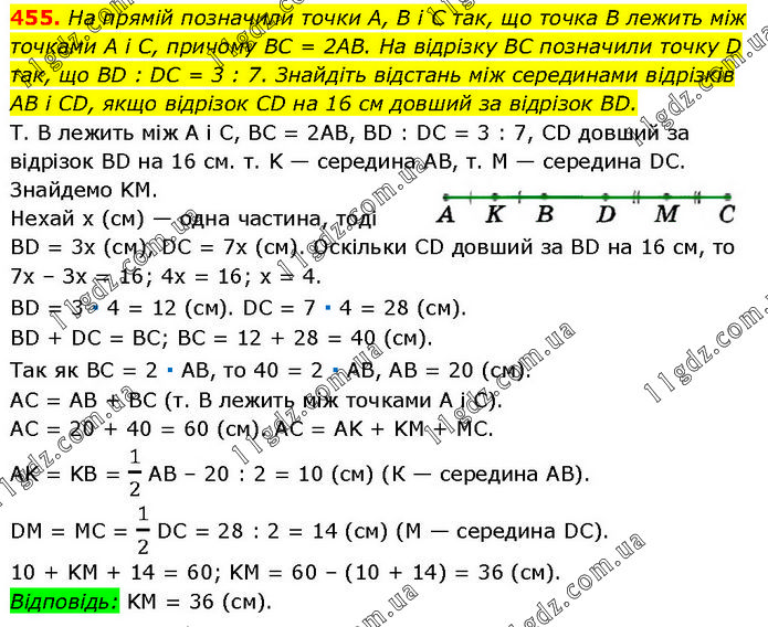 На прямій позначили точки А, В і C так, що точка В лежить між точками А і С, причому ВС = 2АВ. На відрізку BC позначили точку D так, що BD : DC = 3 : 7. Знайдіть відстань між серединами відрізків AB і CD, якщо відрізок CD на 16 см довший за відрізок BD. Т. В лежить між А і С, BC = 2AB, BD : DC = 3 : 7, CD довший за відрізок BD на 16 см. т. K — середина AB, т. M — середина DC. Знайдемо KM. Нехай х (см) — одна частина, тоді BD = 3x (см), DC = 7x (см). Оскільки CD довший за BD на 16 см, то 7х – Зx = 16; 4x = 16; х = 4. BD = 3 ∙ 4 = 12 (см). DC = 7 ∙ 4 = 28 (см). BD + DC = BC; BC = 12 + 28 = 40 (см). Так як BC = 2 ∙ AB, то 40 = 2 ∙ AB, AB = 20 (см). AC = AB + BC (т. B лежить між точками А і С). AC = 20 + 40 = 60 (см). AC = AK + KМ + MC. AK = KB = 1/2AB – 20 : 2 = 10 (см) (К — середина AB). DM = MC = 1/2DC = 28 : 2 = 14 (см) (М — середина DC). 10 + KM + 14 = 60; KM = 60 – (10 + 14) = 36 (см). Відповідь: KM = 36 (см).