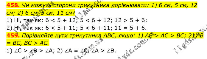 458. Чи можуть сторони трикутника дорівнювати: 1) 6 см, 5 см, 12 см; 2) 6 см, 5 см, 11 см? 1) Ні, так як: 6 < 5 + 12; 5 < 6 + 12; 12 > 5 + 6; 2) Ні, так як: 6 < 5 + 11; 5 < 6 + 11; 11 = 5 + 6. 459. Порівняйте кути трикутника ABC, якщо: 1) AB > АС > BC; 2) AB = BC, BC > AC. 1) ∠C > ∠B > ∠A; 2) ∠A = ∠C, ∠A > ∠B.