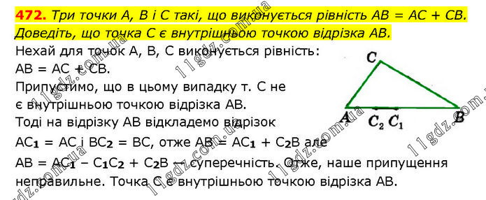 Три точки А, В і C такі, що виконується рівність AB = AC + CB. Доведіть, що точка C є внутрішньою точкою відрізка AB. Нехай для точок A, В, C виконується рівність: AB = AC + CB. Припустимо, що в цьому випадку т. C не є внутрішньою точкою відрізка AB. Тоді на відрізку AB відкладемо відрізок AC1 = AC і BC2 = BC, отже AB = AC1 + C2B але AB = AC1 – C1C2 + C2B — суперечність. Отже, наше припущення неправильне. Точка C є внутрішньою точкою відрізка AB.