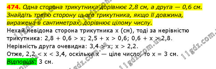 Одна сторона трикутника дорівнює 2,8 см, а друга — 0,6 см. Знайдіть третю сторону цього трикутника, якщо її довжина, виражена в сантиметрах, дорівнює цілому числу. Нехай невідома сторона трикутника х (см), тоді за нерівністю трикутника: 2,8 + 0,6 > х; 2,5 + х > 0,6; 0,6 + х > 2,8. Нерівність друга очевидна: 3,4 > х; х > 2,2. Отже, 2,2 < х < 3,4, оскільки х — ціле число, то х = 3 см. Відповідь: 3 см.