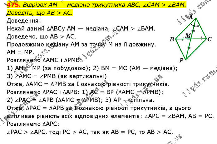 Відрізок AM — медіана трикутника ABC, ∠CAM > ∠BAM. Доведіть, що AB > AC. Доведення: Нехай даний ∆ABCy AM — медіана, ∠CAM > ∠BAM. Доведемо, що AB > AC. Продовжимо медіану AM за точку M на її довжину. AM = MP. Розглянемо ∆AMC і ∆PMВ: 1) AM = MP (за побудовою); 2) BM = MC (AM — медіана); 3) ∠AMC = ∠PMB (як вертикальні). Отже, ∆AMC = ∆PMB за I ознакою рівності трикутників. Розглянемо ∆PAC і ∆APB: 1) AC = BP (∆АМС = ∆PMВ); 2) ∠PAC = ∠APB (∆АМС = ∆PMB); 3) AP — спільна. Отже, ∆PAC = ∆APB за І ознакою рівності трикутників, з цього випливає рівність всіх відповідних елементів: ∠APC = ∠BAM, AB = PC. Розглянемо ∆АРС: ∠PAC > ∠APC, тоді PC > AC, так як AB = PC, то AB > AC.