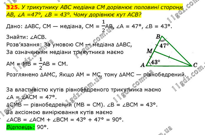 У трикутнику ABC медіана CM дорівнює половині сторони AB, ∠A =47°, ∠B = 43°. Чому дорівнює кут ACB? Дано: ∆ABC, CM — медіана, CM = 1/2AB, ∠A = 47°, ∠B = 43°. Знайти: ∠ACB. Розв’язання: За умовою CM — медіана ∆АВС, За означенням медіани трикутника маємо AM = MB = 1/2AB = CM. Розглянемо ∆АМС, Якщо AM = MC, тому ∆AMC — рівнобедрений. За властивістю кутів рівнобедреного трикутника маємо ∠A = ∠ACM = 47°. ∆CMB — рівнобедрений (MB = CM). ∠B = ∠BCM = 43°. За аксіомою вимірювання кутів маємо ∠ACB = ∠ACM + ∠BCM = 43° + 47° = 90°. Відповідь: 90°.